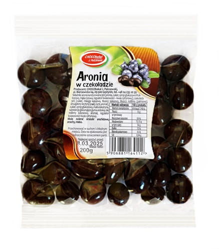 Aronia kandyzowana 56%, czekolada 30% - masa kakaowa min 35% w czekoladzie, oprócz tłuszczu kakaowego zawiera tłuszcze roślinne, cukier, miazga kakaowa, tłuszcz kakaowy, tłuszcz roślinny palmowy, syrop glukozowo-fruktozowy, mąka ryżowa, syrop glukozowy, kwas cytrynowy E330 regulator kwasowości, emulgator (lecytyna z soi, E476), maltodekstryna, guma arabska E414, olej kokosowy, aromat