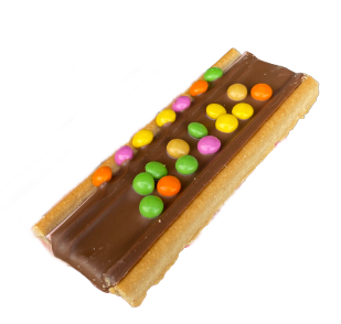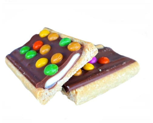 Kruche ciasteczko podlane polewą z nadzieniem kokosowym i czekoladowymi drażetkami