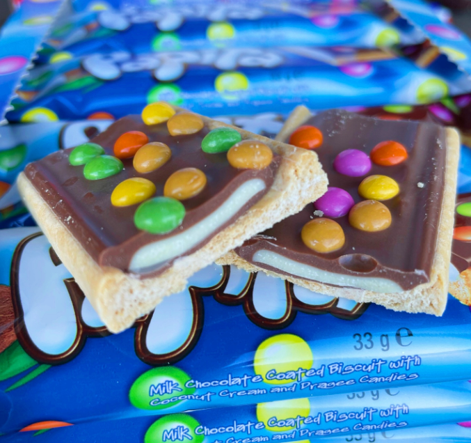 Ciastko 34% [mąka pszenna (zawiera gluten), olej roślinny (palmowy), cukier, syrop glukozowo-fruktozowy, substancje spulchniające: węglany amonu, fosforany sodu, węglany sodu, mleko pełne w proszku, sól, emulgator: lecytyny (ze słonecznika); aromat], czekolada mleczna (33%) [cukier, tłuszcz kakaowy, serwatka w proszku (z mleka), mleko pełne w proszku, miazga kakaowa, emulgator: lecytyny (ze słonecznika); aromat], nadzienie kokosowe (22%) [cukier, olej roślinny (palmowy), kokos (12%), serwatka w proszku (z mleka), mleko pełne w proszku, emulgator: lecytyny (ze słonecznika); aromat], draże (11%) [cukier, olej roślinny (palmowy), serwatka w proszku (z mleka), kakao w proszku, skrobia kukurydziana, barwniki: dwutlenek tytanu, karoteny, czerwień buraczana, kurkumina; substancja zagęszczająca: guma arabska; emulgator: lecytyny (ze słonecznika), substancja glazurująca: wosk carnauba; aromat]