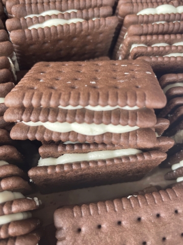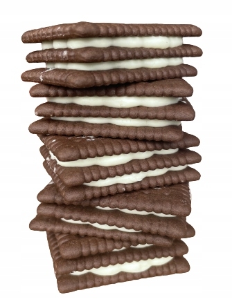 Pysznie chrupiące ciastka o delikatnym kakaowym smaku, przełamane smakiem kremu śmietankowego