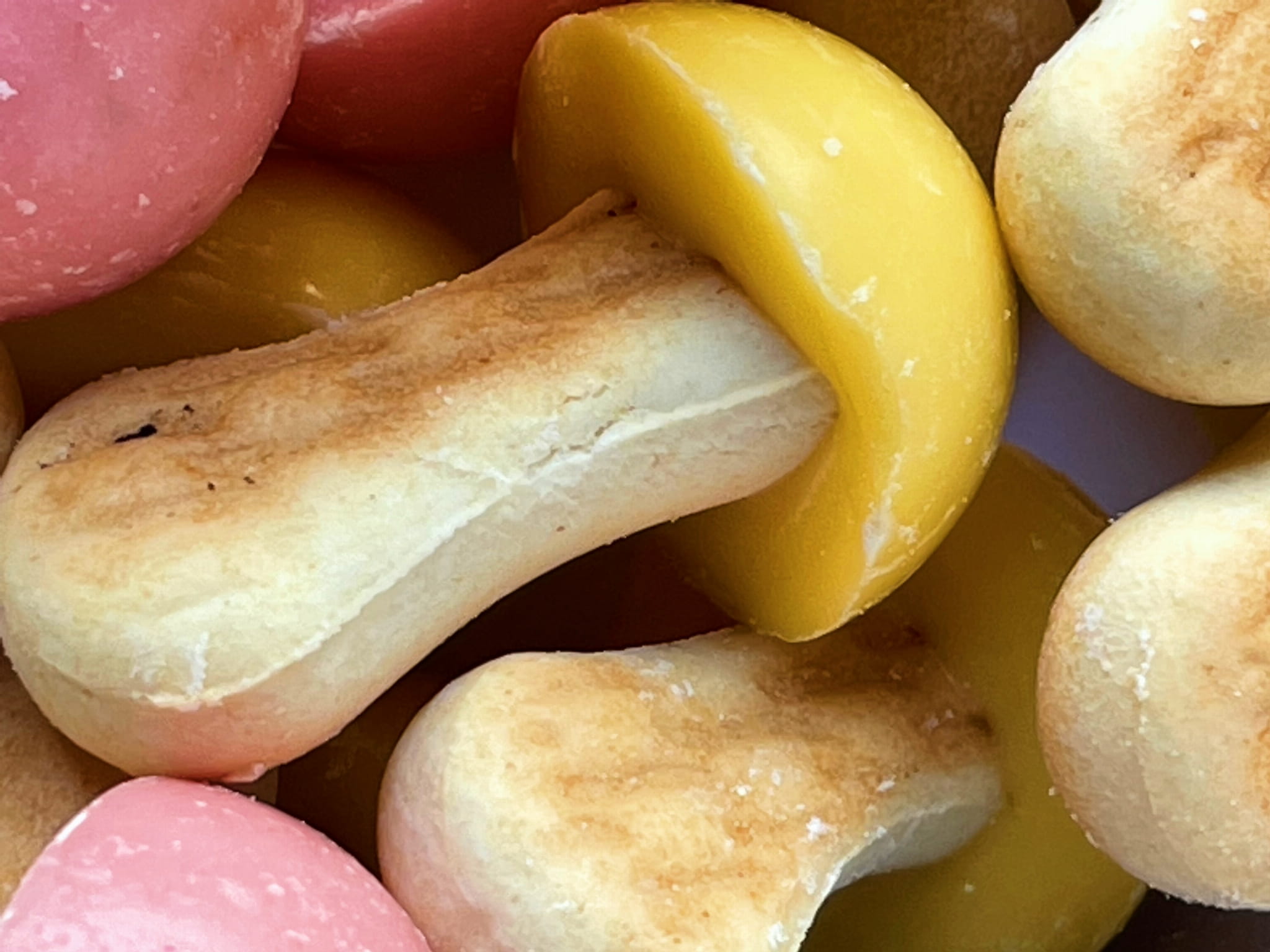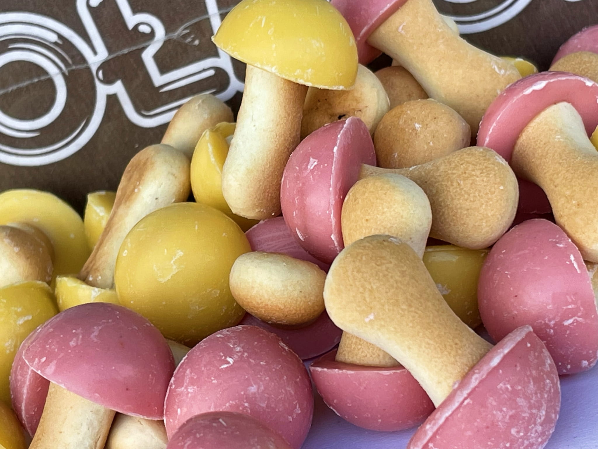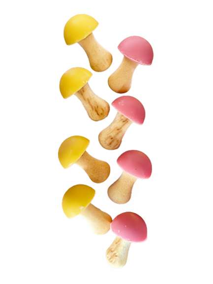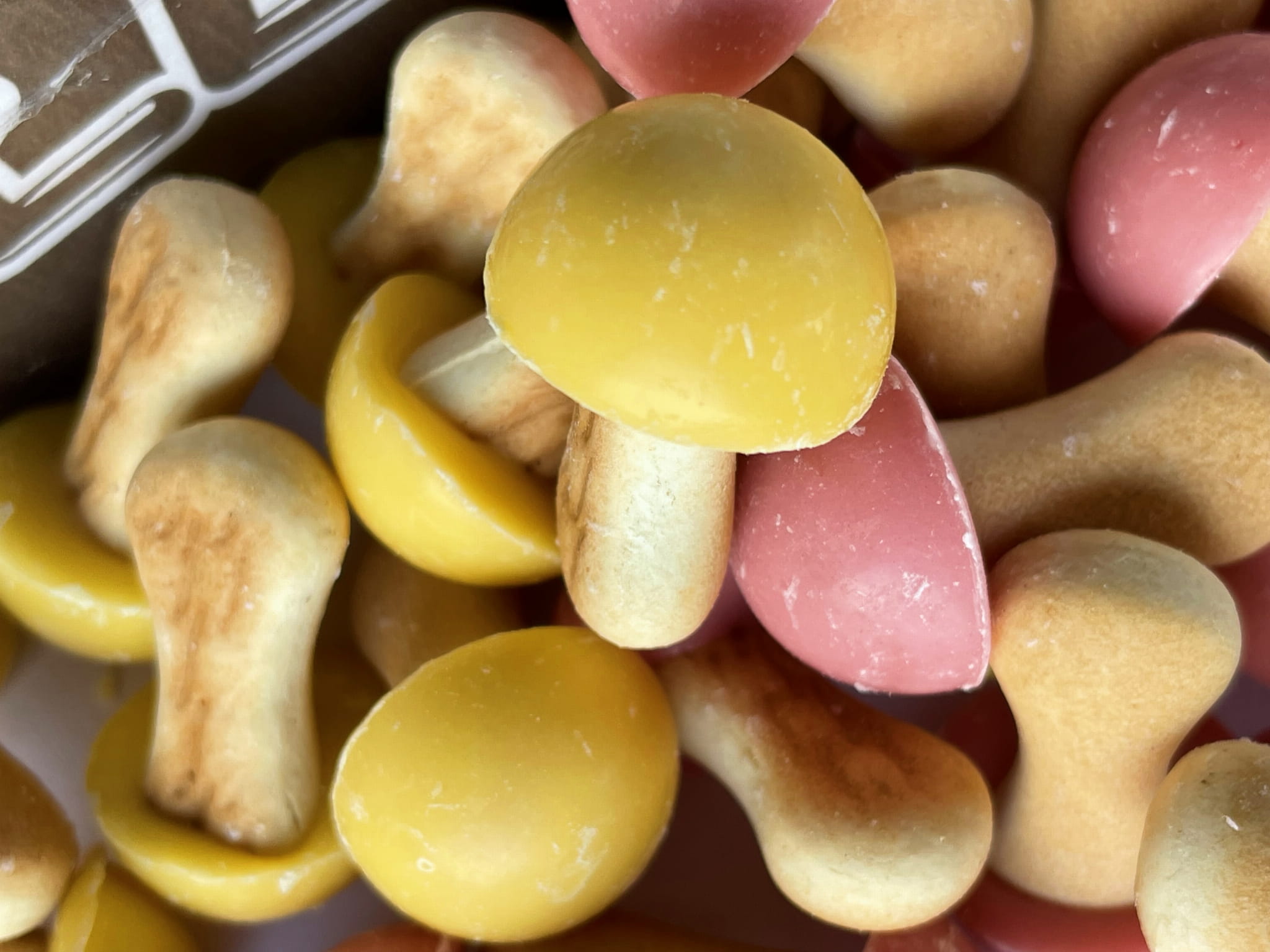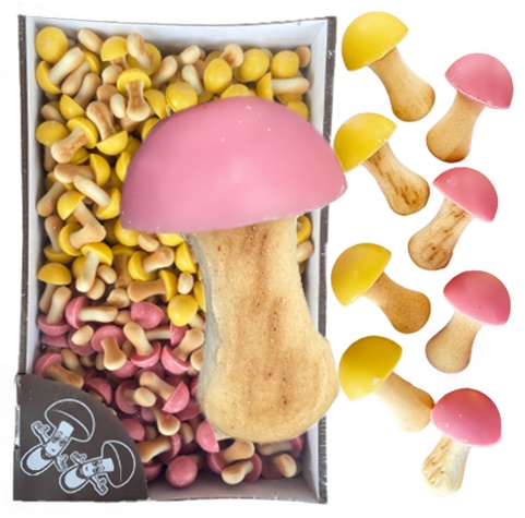 Chrupiące ciasteczka w kształcie grzybków z łepkiem o smaku truskawkowym lub bananowym