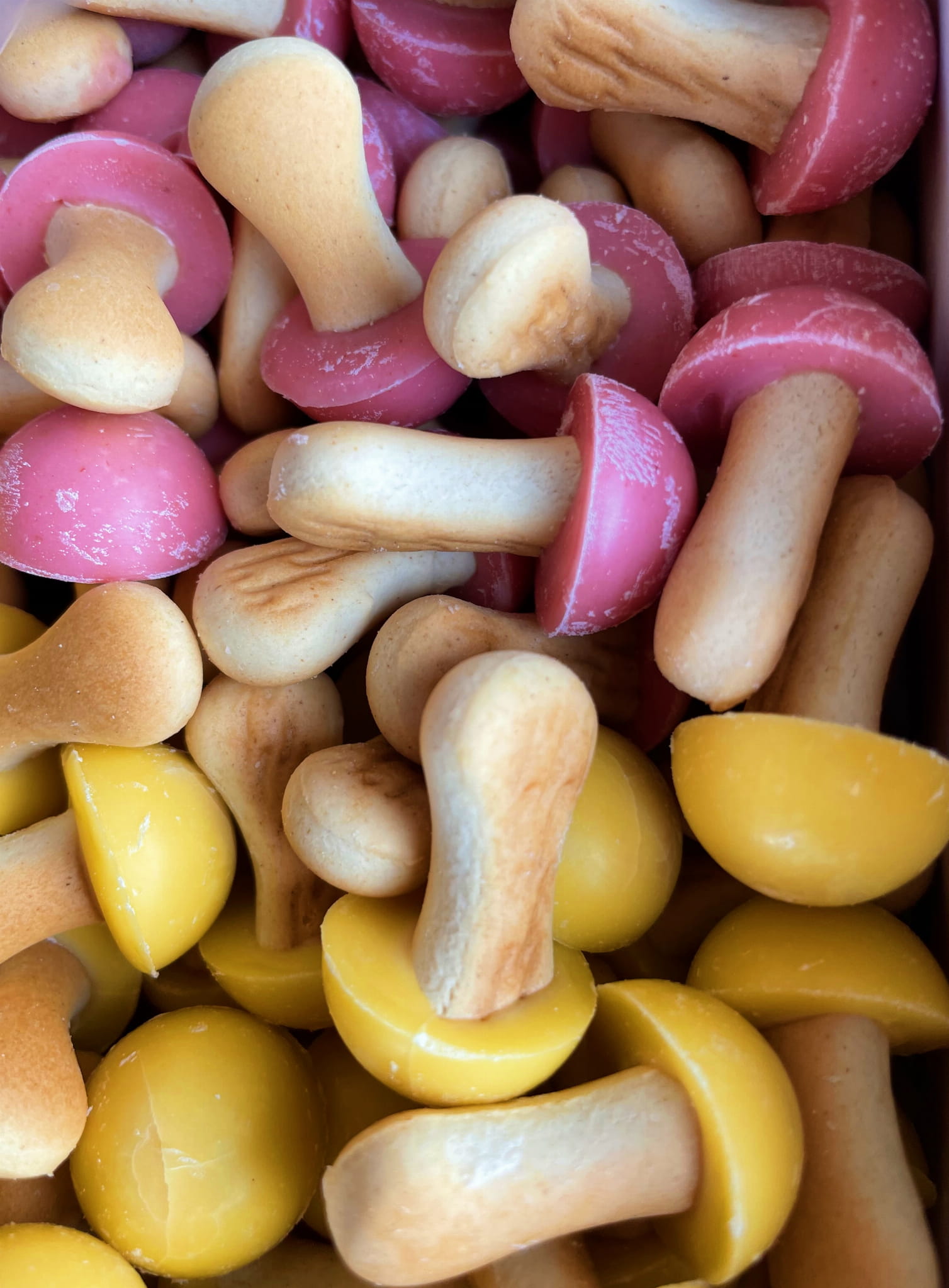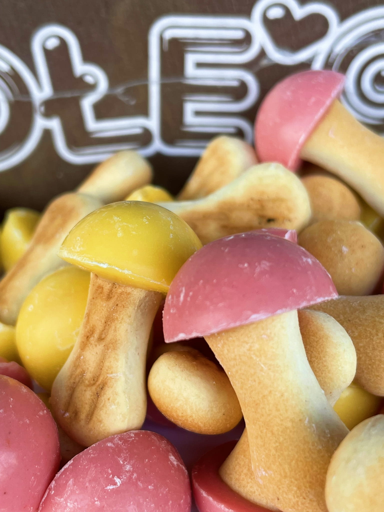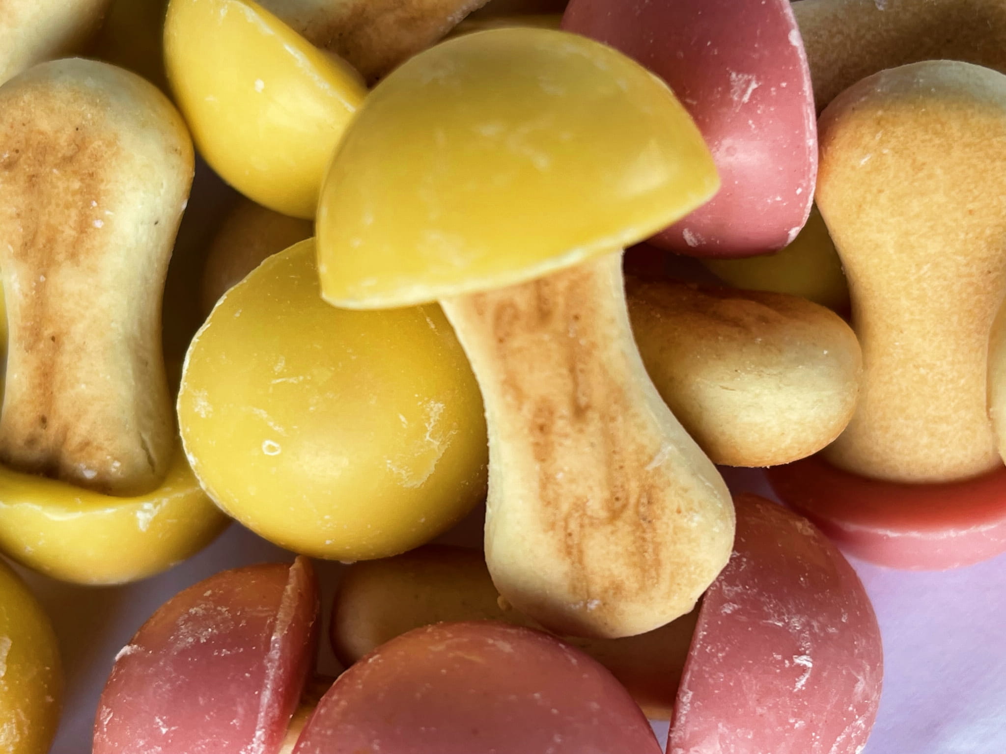 Chrupiące ciasteczka w kształcie grzybków z łepkiem o smaku truskawkowym lub bananowym