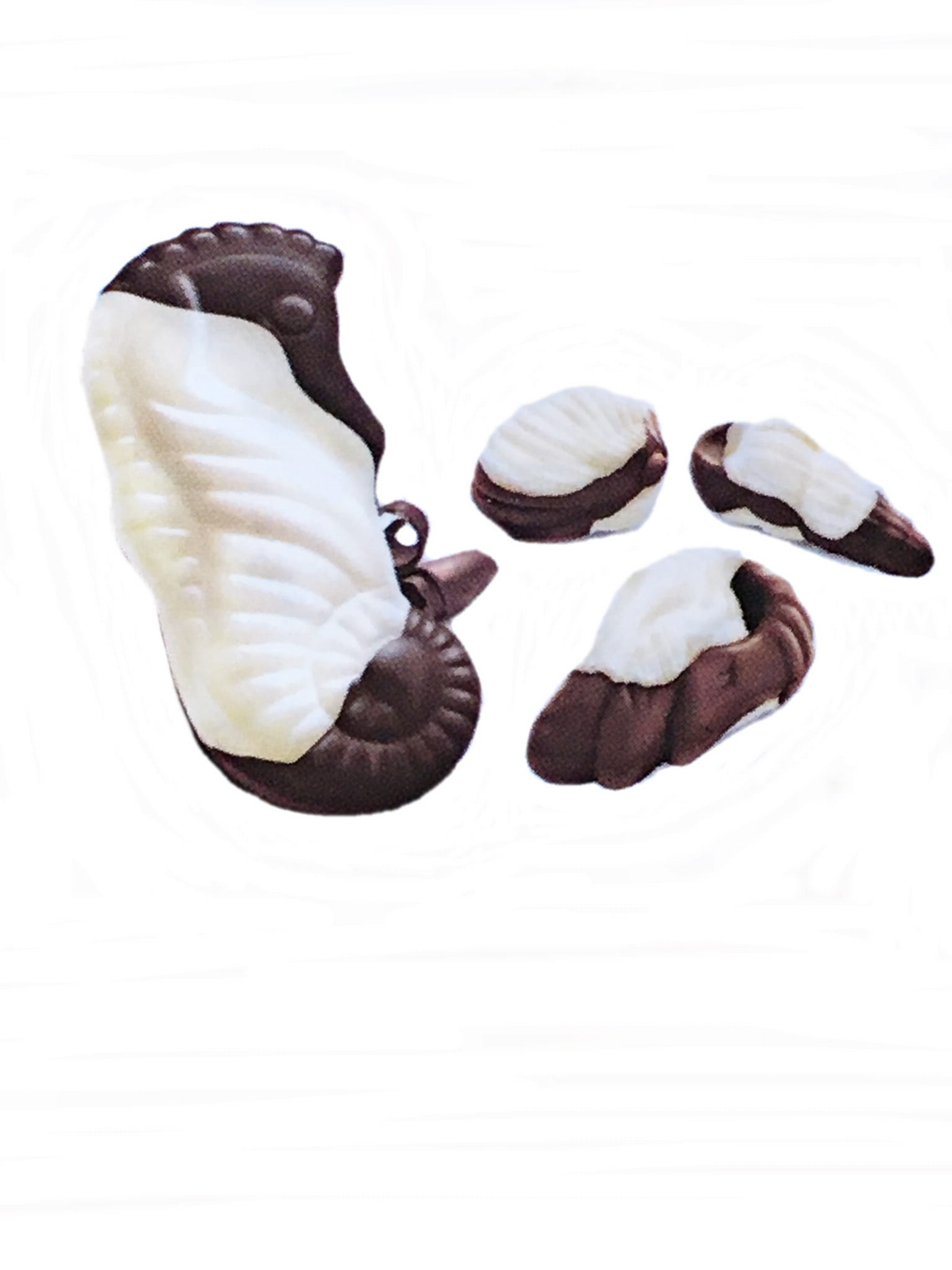 Praliny z czekolady mlecznej (34%), nadziewane kremem orzechowym i mlecznym (57%), zdobione białym kremem