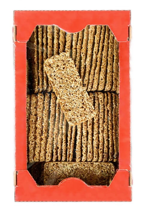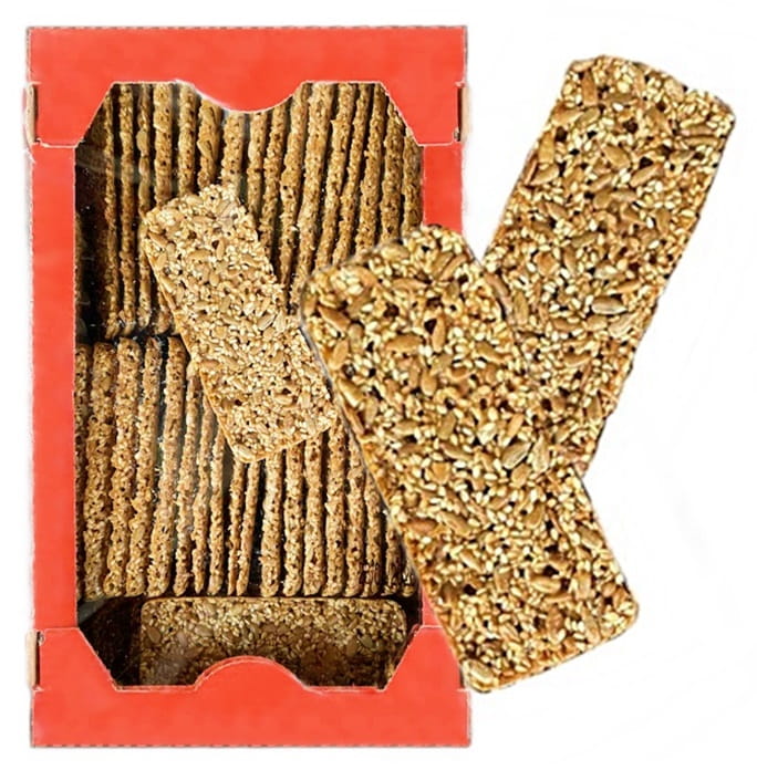 Ziarna sezamu 41%, słonecznika 23%, mieszanka piekarnicza (cukier, syrop glukozowy, olej roślinny (palmowy nieutwardzony), pełne mleko w proszku, emulgator lecytyna sojowa, aromat
