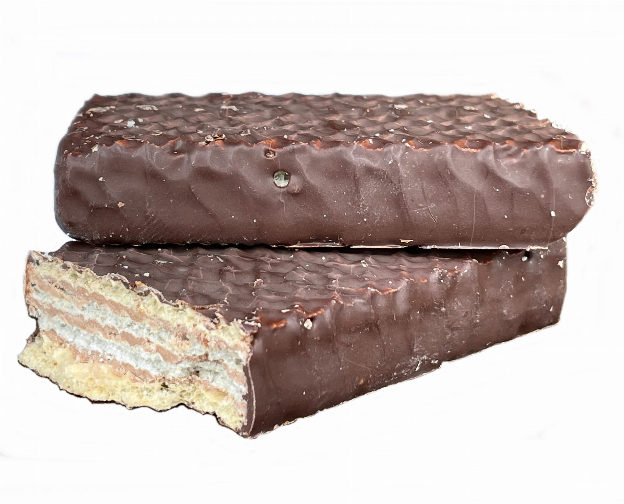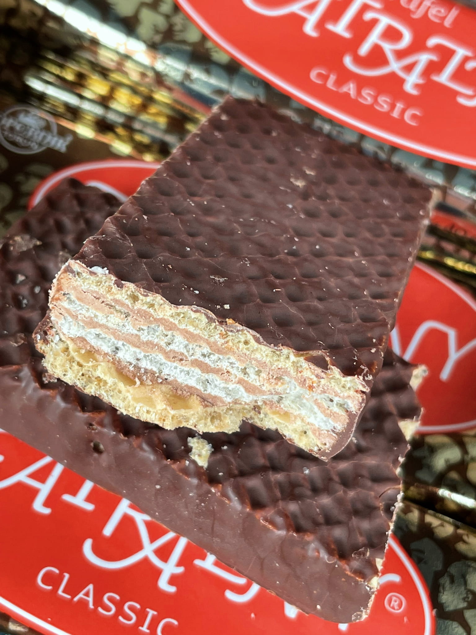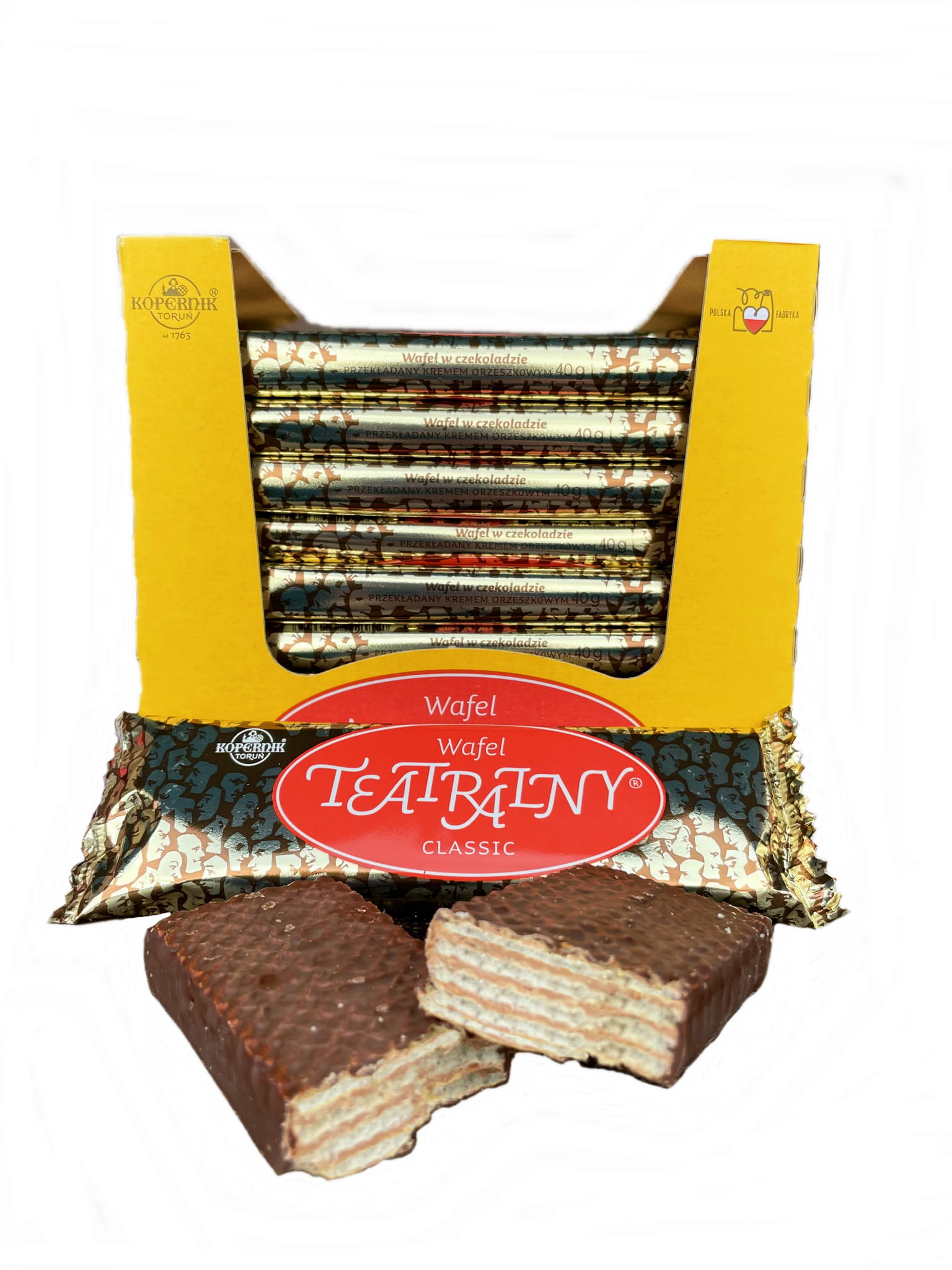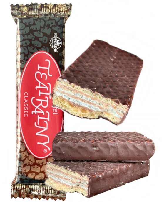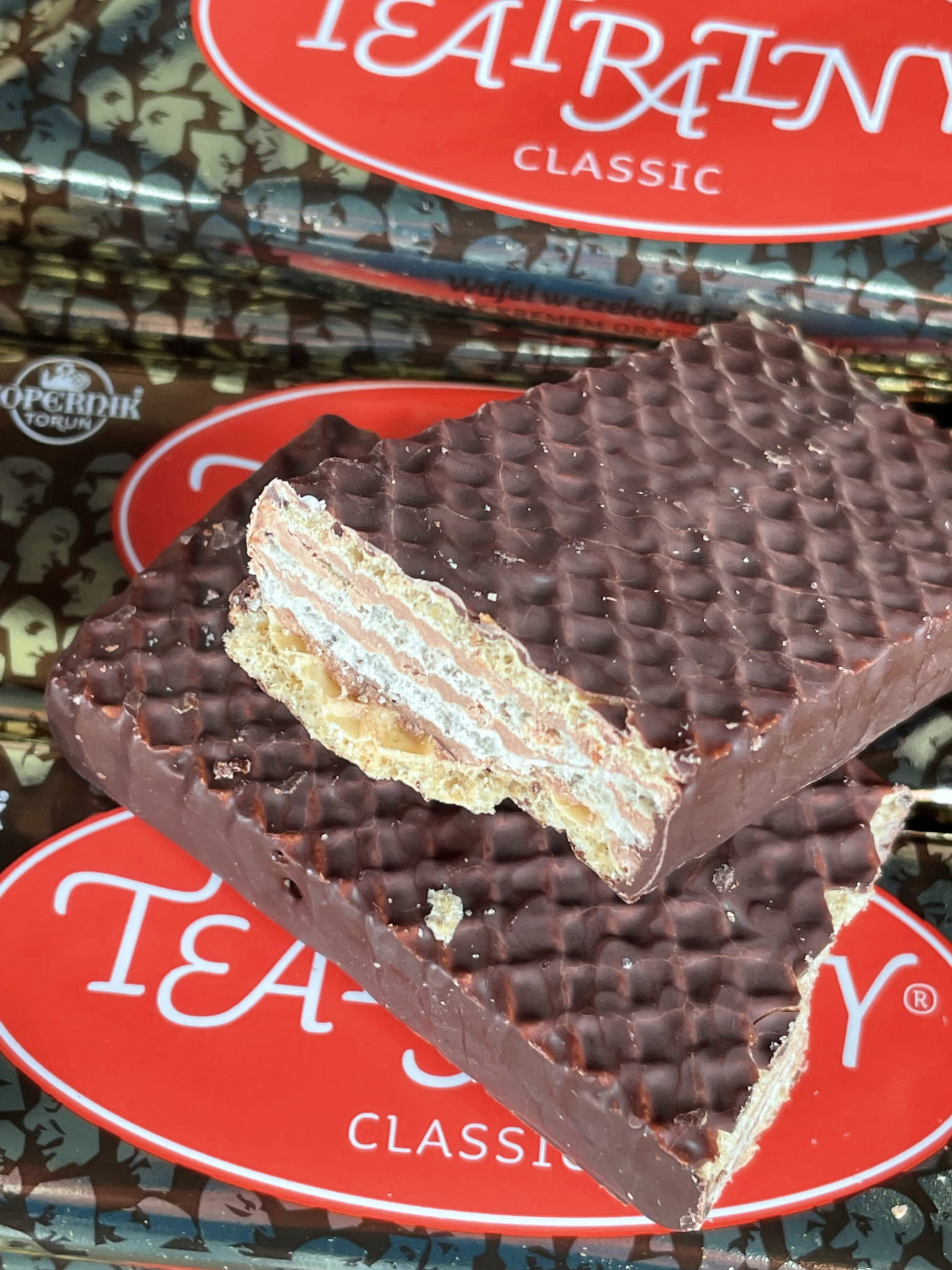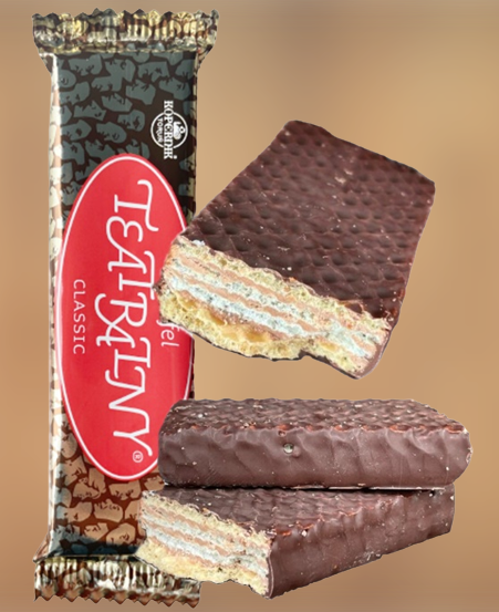 Chrupiący wafelek przekładany kremem orzeszkowym, oblany pyszną czekoladą, klasyka czasów PRL