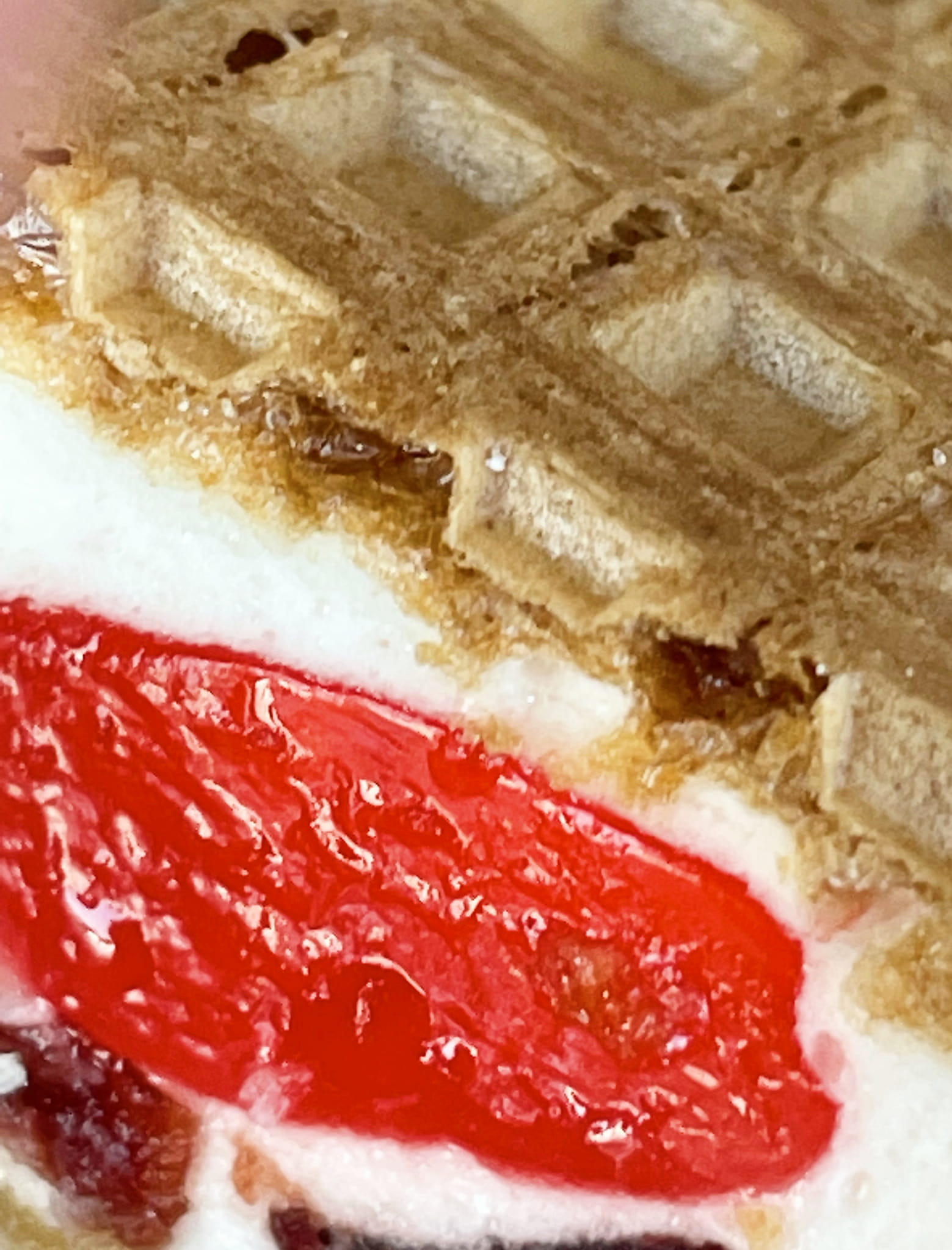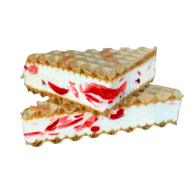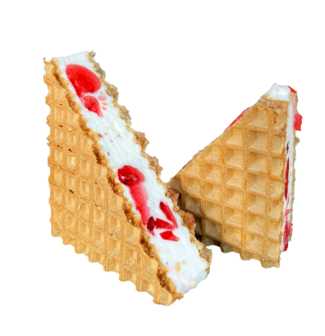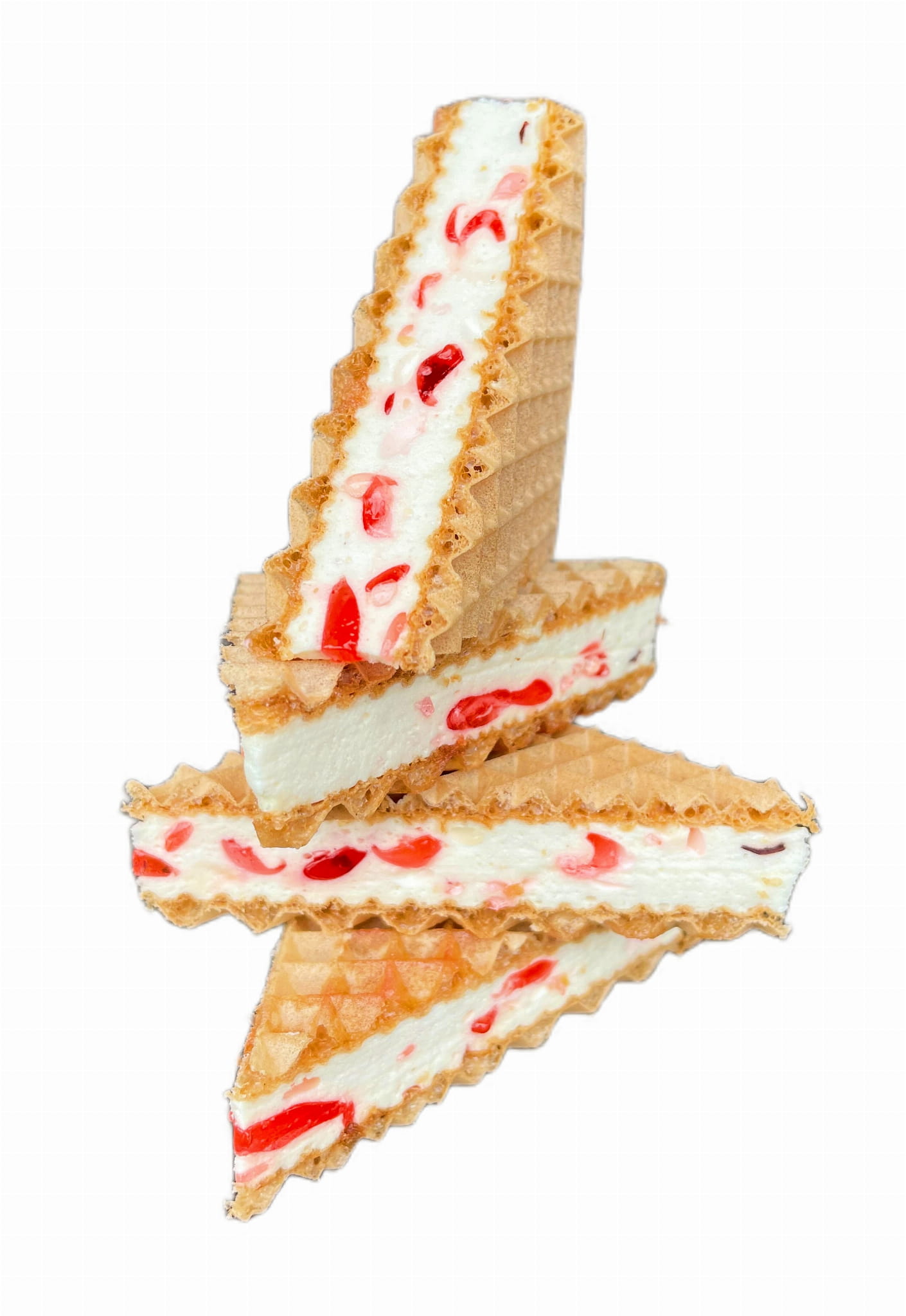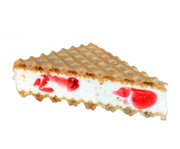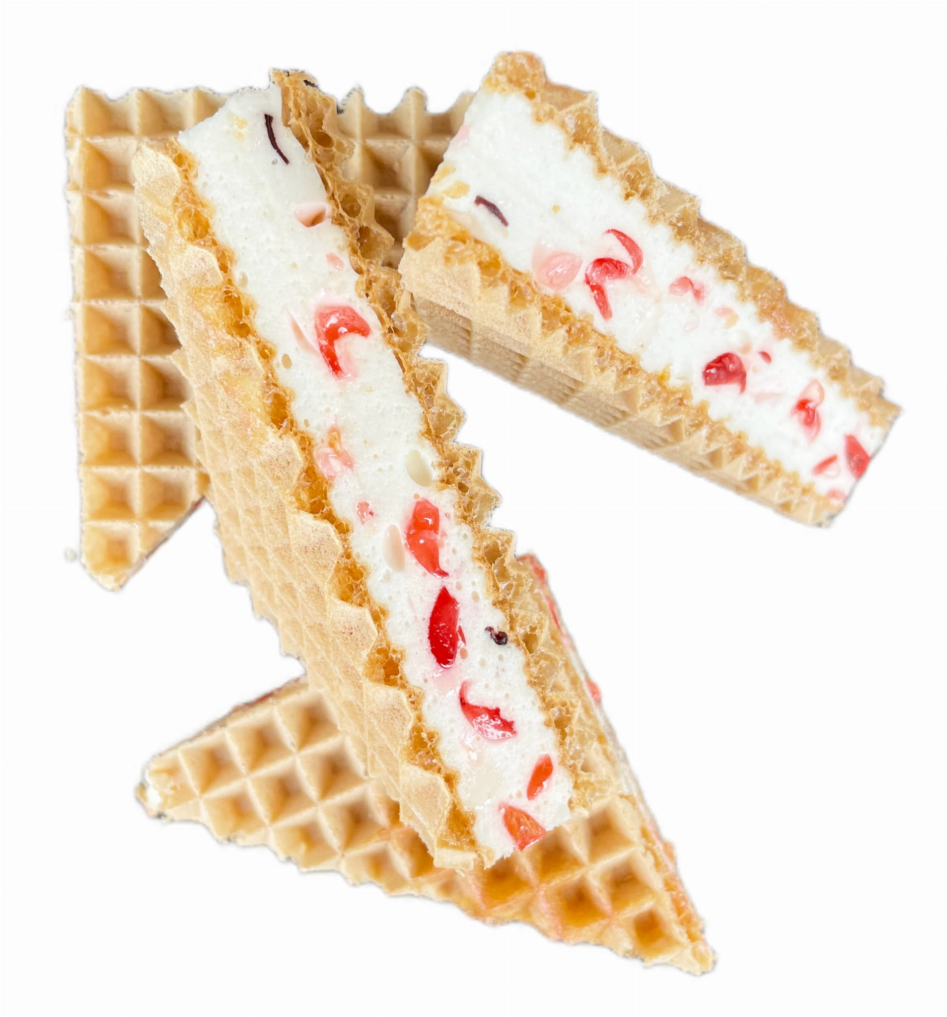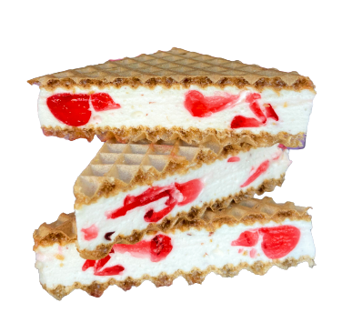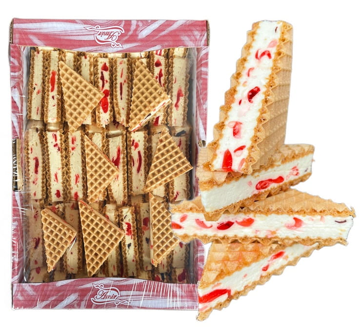 Wafle przekładane pianką z kawałkami kolorowych galaretek o smaku wiśniowym